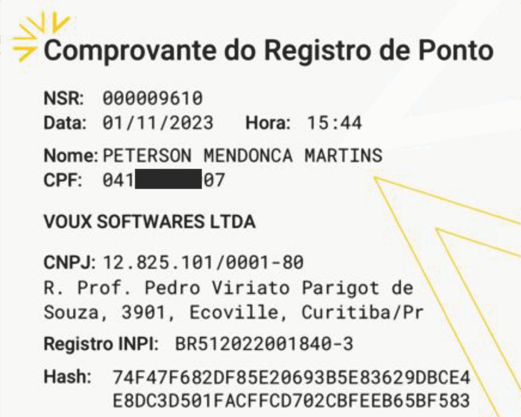 Recebe o comprovante de registro do ponto (Certificado INPI) no e-mail cadastrado do colaborador.